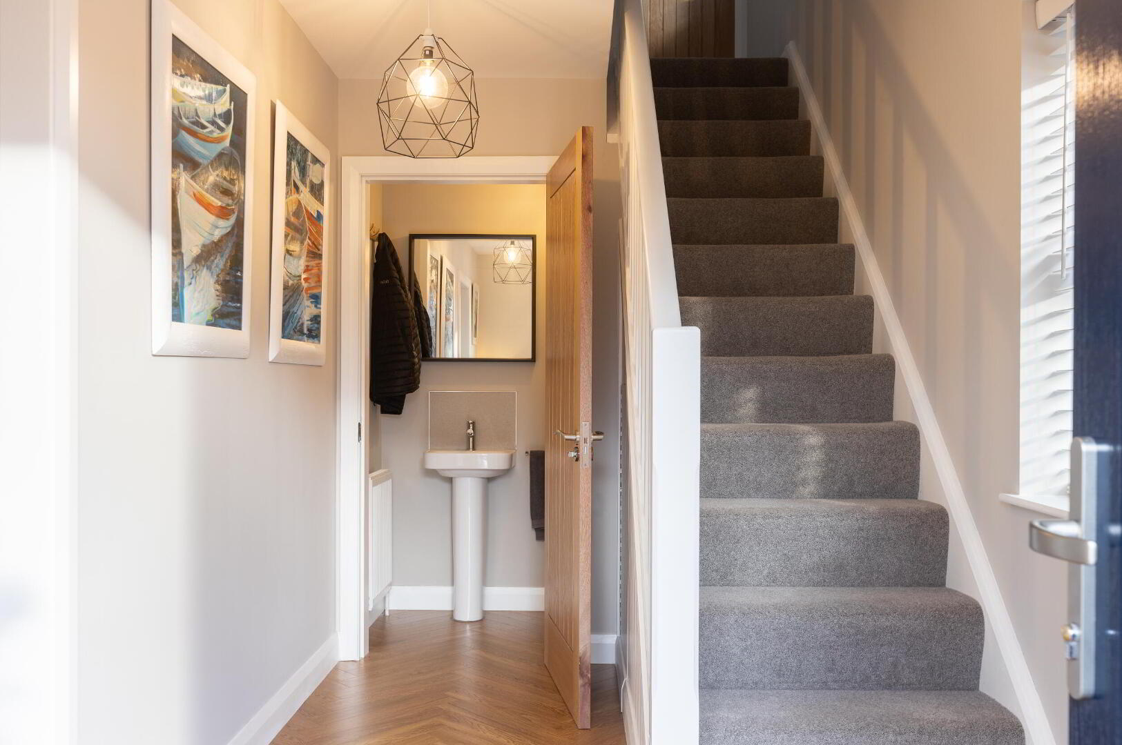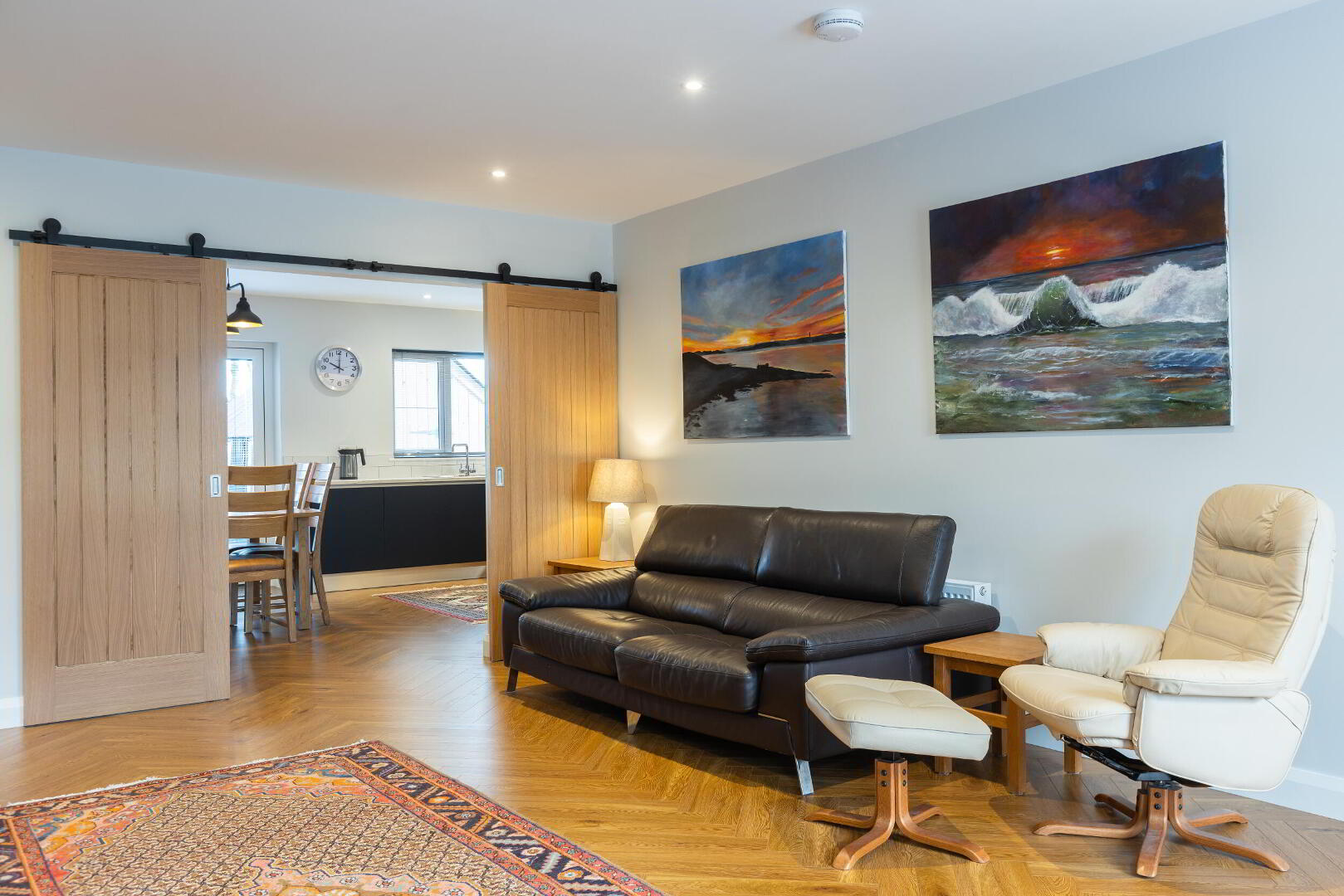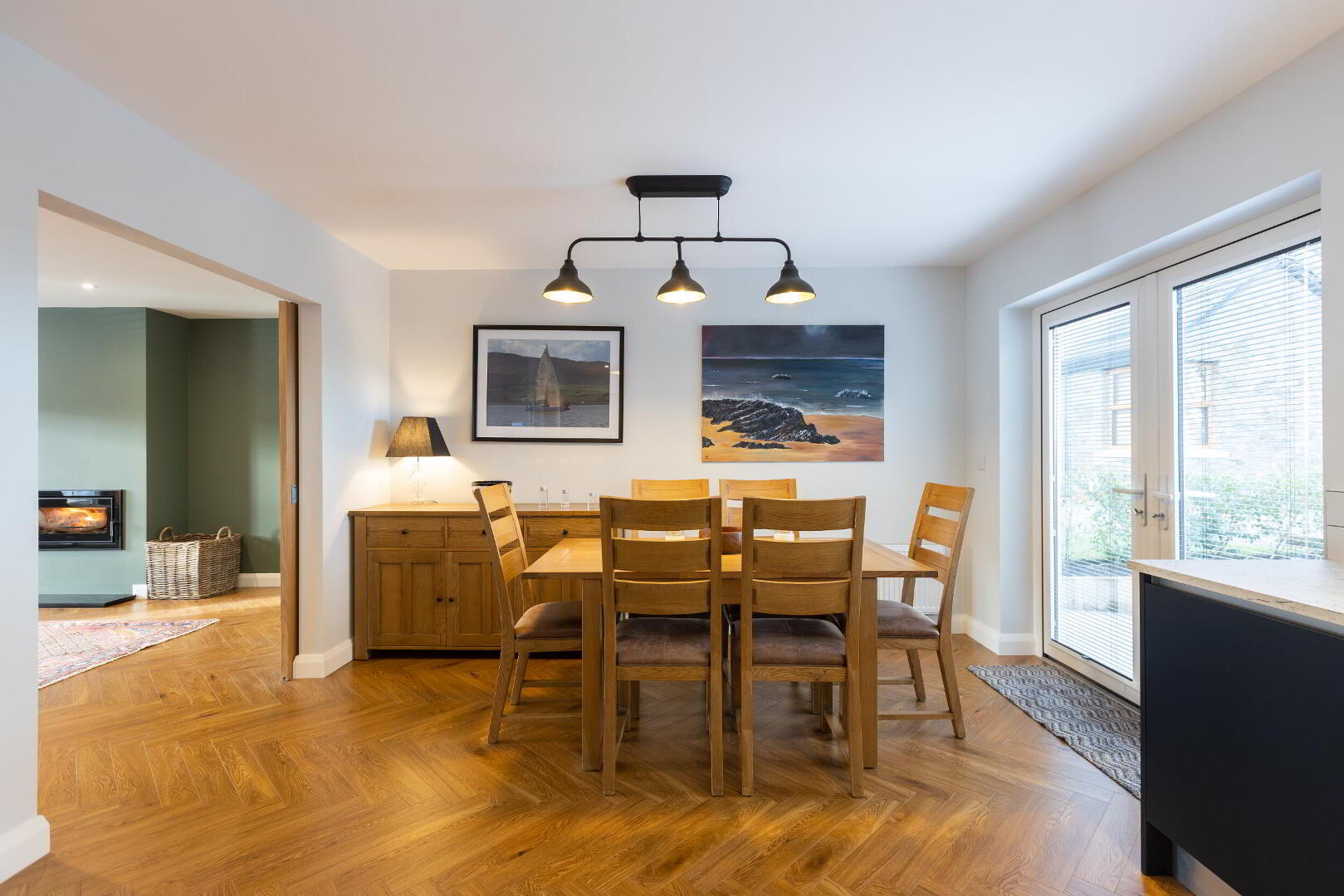 The ground floor accommodation is beautifully laid out with an open plan configuration. It comprises of a lounge with feature contemporary wood burning stove and sliding doors opening to the modern fully fitted kitchen and dining area with and range of integrated appliances plus a separate utility room off the kitchen.